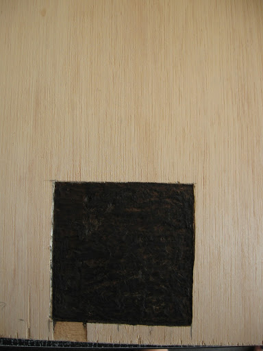 Then of course I had to seal it, or the charcoal would just rub right off, so I used a fixative, which worked great and left a matte finish. Then there was a small imperfection in the wood that had to be fixed. The top ply was slightly flawed at the edge in one small area, so when I carved it away from the fireplace, which was a half-inch from the bottom edge, that ply separated from the bottom edge too in a small spot: