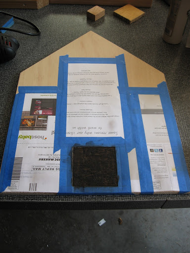 First I marked out the size and location of the fireplace, based on the exterior chimney size and location. Then I used my dremel tool to carve away the top ply of the plywood, and I did it roughly to get some nice texture. Then I used my woodburner to burn the wood inside the fireplace, which took MUCH longer than I expected — the plywood doesn’t char as quickly as pine or cedar, and the texture made it challenging to burn it evenly. Here it is about half-finished: