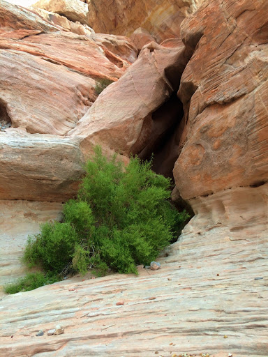 You reach the bottom, which is a dry riverbed. You squeeze through a narrow slot canyon (the first on the trip, more to come!), your shoulders brushing the walls. On the other side, the sun is just sinking behind the horizon, catching the red of the rocks and the surprising green of a bush.