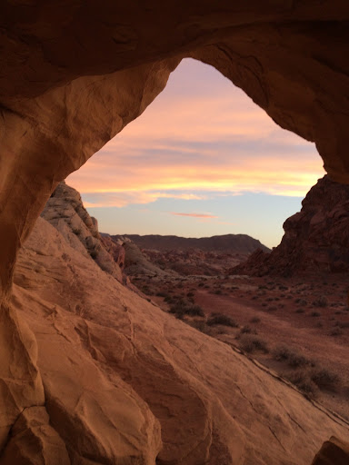 You continue on, gradually climbing back up, as the colors in the sky slowly shift along with the colors in the rock. Some of the shapes and hollows in the rock are bigger than others; finally you come to an arch, like a cave that’s gone all the way through to the other side. Obviously you crawl inside, like any self-respecting hobbit hiker, and huddle up against the sandstone to admire the sky.