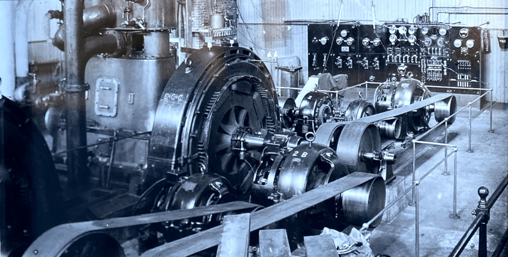 All this takes an enormous amount of power, and there’s a separate building for that. The power house is a good distance away (about 150 meters/500 feet) to reduce interference from electricity, magnetism and general noise. It’s incredibly loud, with four huge 5,000 volt DC generators, three of which are used to power the array as well as charge the massive standby battery (actually over 6,000 2 volt batteries arranged in sequence) in the condenser house. The fourth generator is kept as a backup to ensure continuous operation if any one generator fails. The generators in turn are powered by steam engines directly coupled to huge alternators (500kw each, weighing 10.5 and 7.5 tons), and there are two mammoth 10-ton flywheels in the building as well.