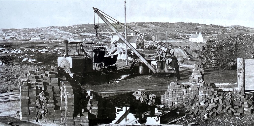 On a quiet evening near Clifden in the winter of 1907, you can hear a distant rumble: the din from the enormous transmitter. A steam engine powers a 15,000 volt DC generator by consuming a mix of coal, brought in by railroad, and local peat bricks, shoveled by hand from the surrounding bog and dried in the sun. A 1921 report noted that the station used up to 6,000 tons of peat per year.