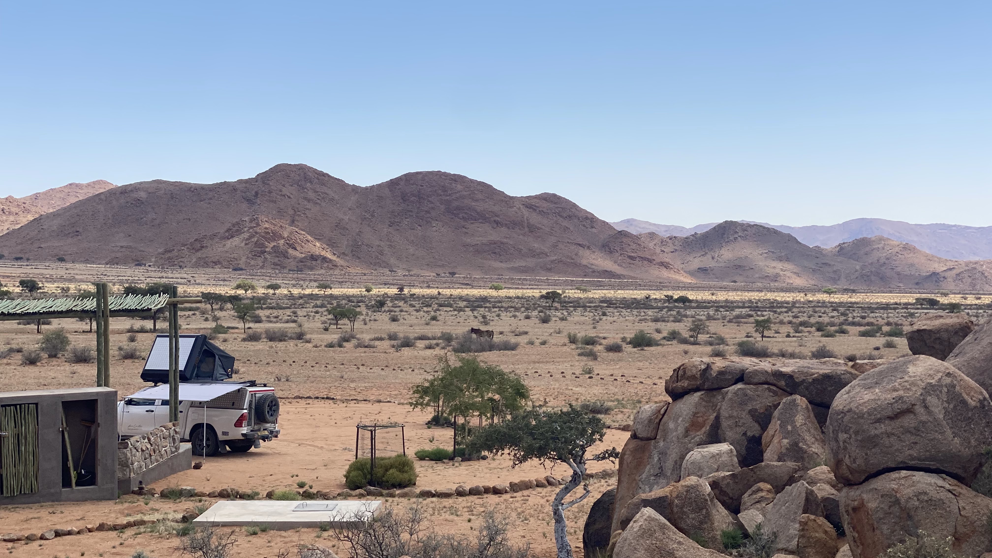 Namibgrens Guest Farm has a set of 12 well-spaced campsites in a mountain valley about 3 hours out of Windhoek. It’s a lovely spot, safe and beautiful, with good shade, hot water, and flush toilets, but no electricity. The water is heated by a donkey (translation: a wood-fired hot water tank) which the farm staff lights in the afternoon; it stays hot through the following morning. We stayed in Campsite #1 and would highly recommend it.