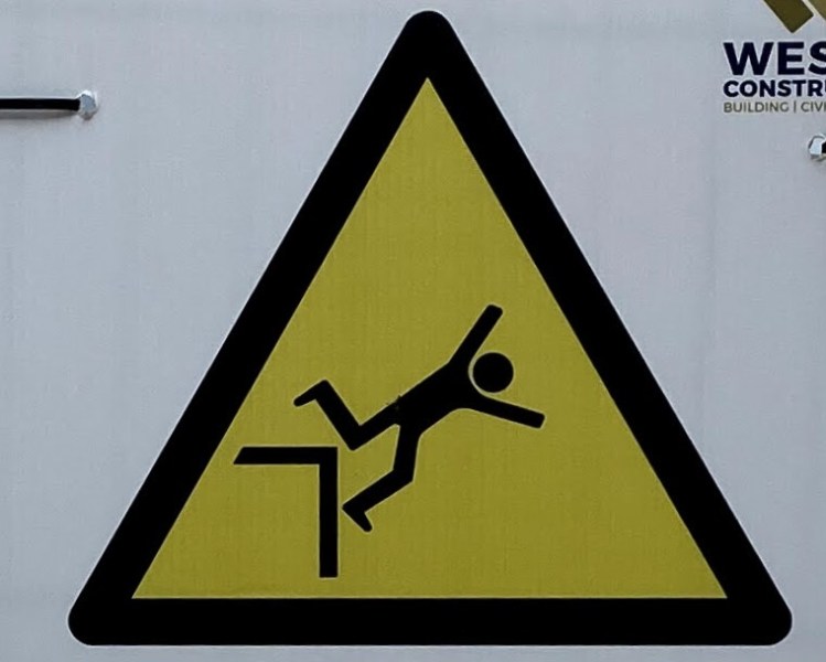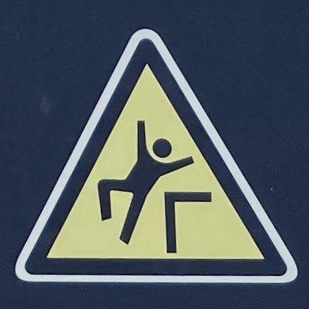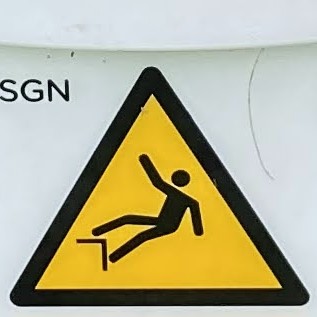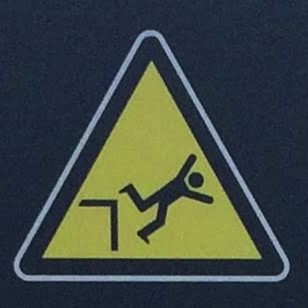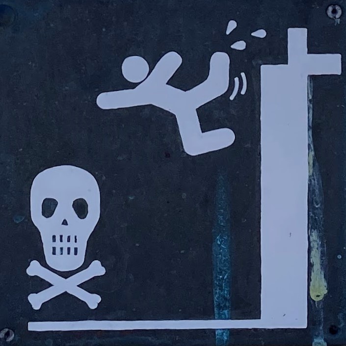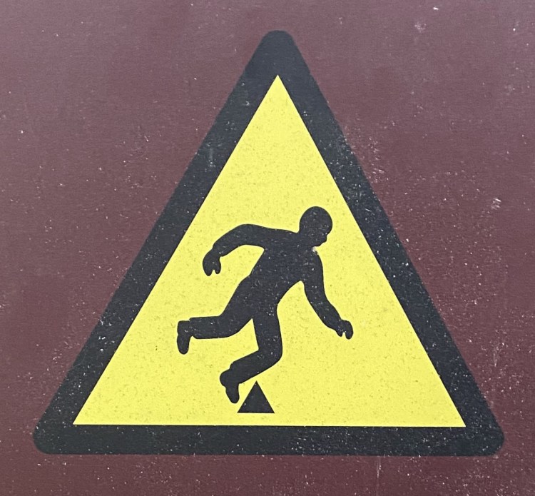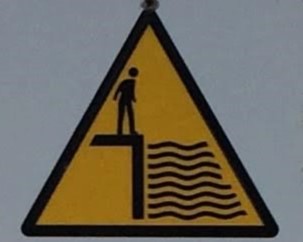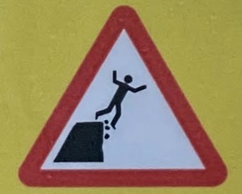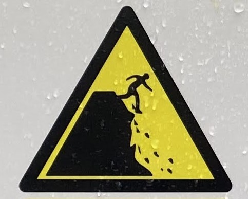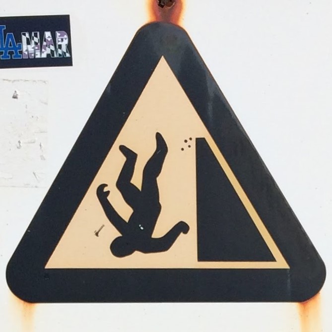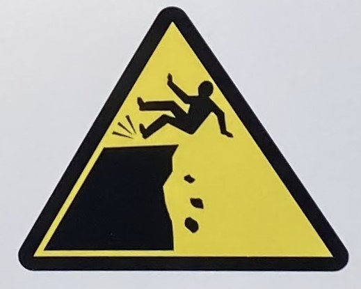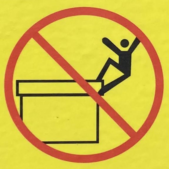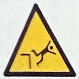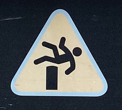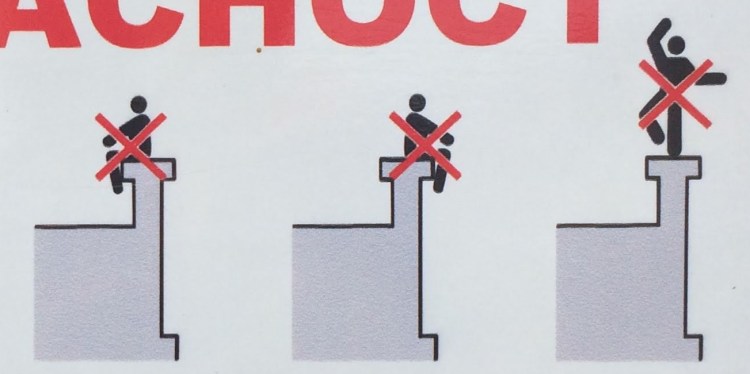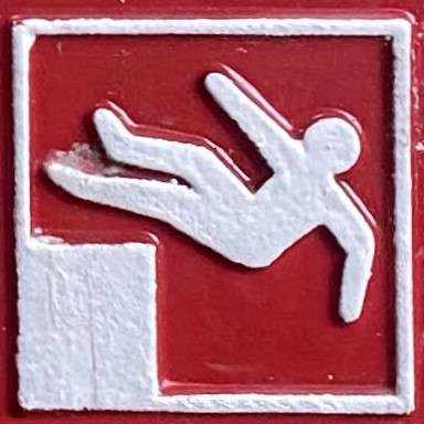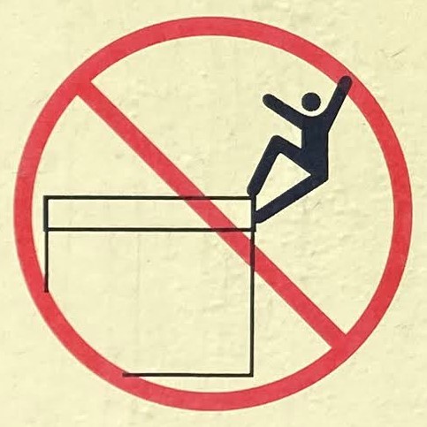 It’s hard to choose where to start with this category! As with Slips and Trips, we’ll encounter some repeated figures in different situations, and a wide variety of scenarios. Let’s begin at the beginning, with what I like to call the Pre-Fall. These are the figures who are courting danger, and these signs often appear a little distance back from the fall hazard, or sometimes next to a more graphic Fall sign.