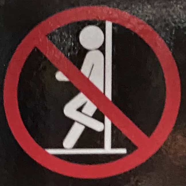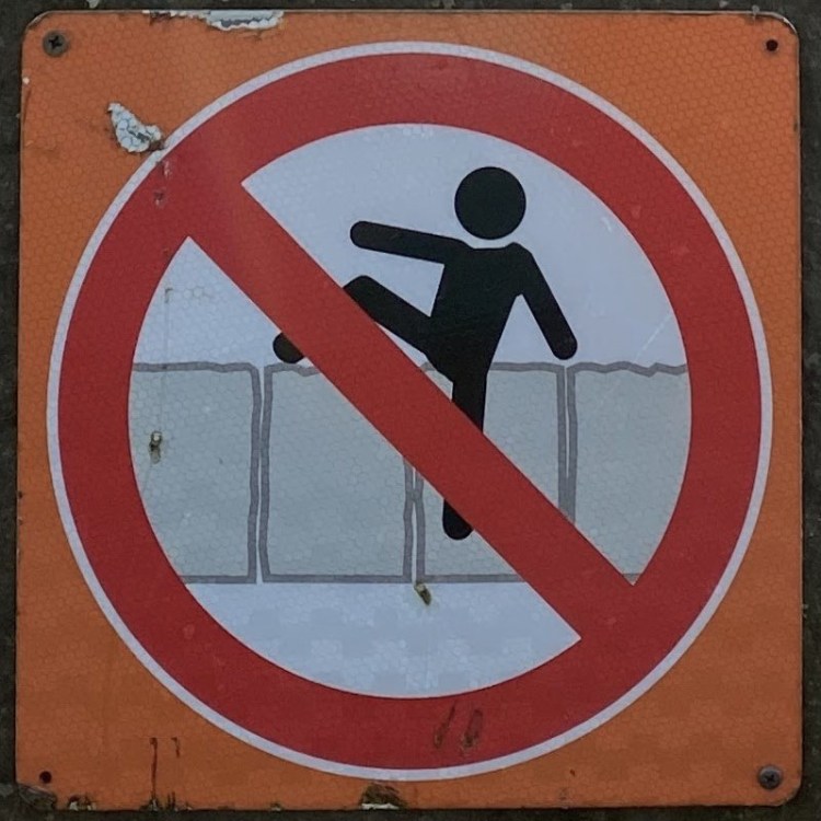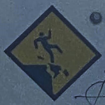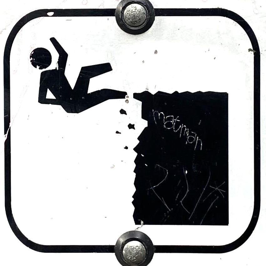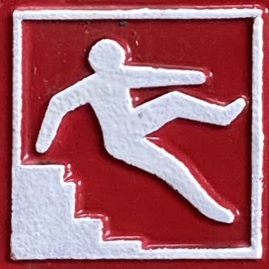 The human figure differences are more subtle, but this one has some nice variety. There are differences in the rounded corners of the figure (knees, ends of arms, shoulders), in the distance between the head and the body, in the relation of the figure to the surface it’s falling from and the border of the sign, and even in the angle of the figure.